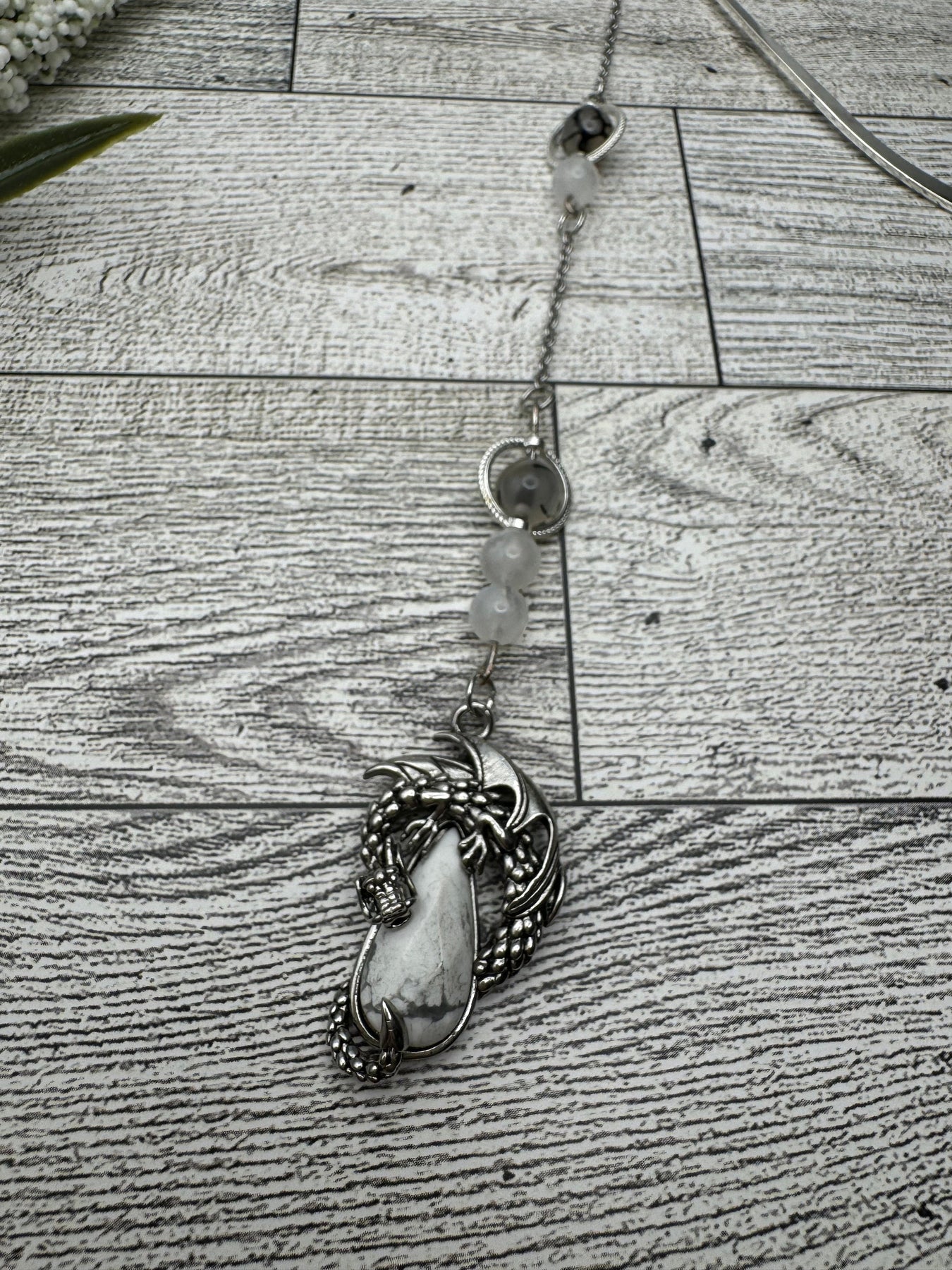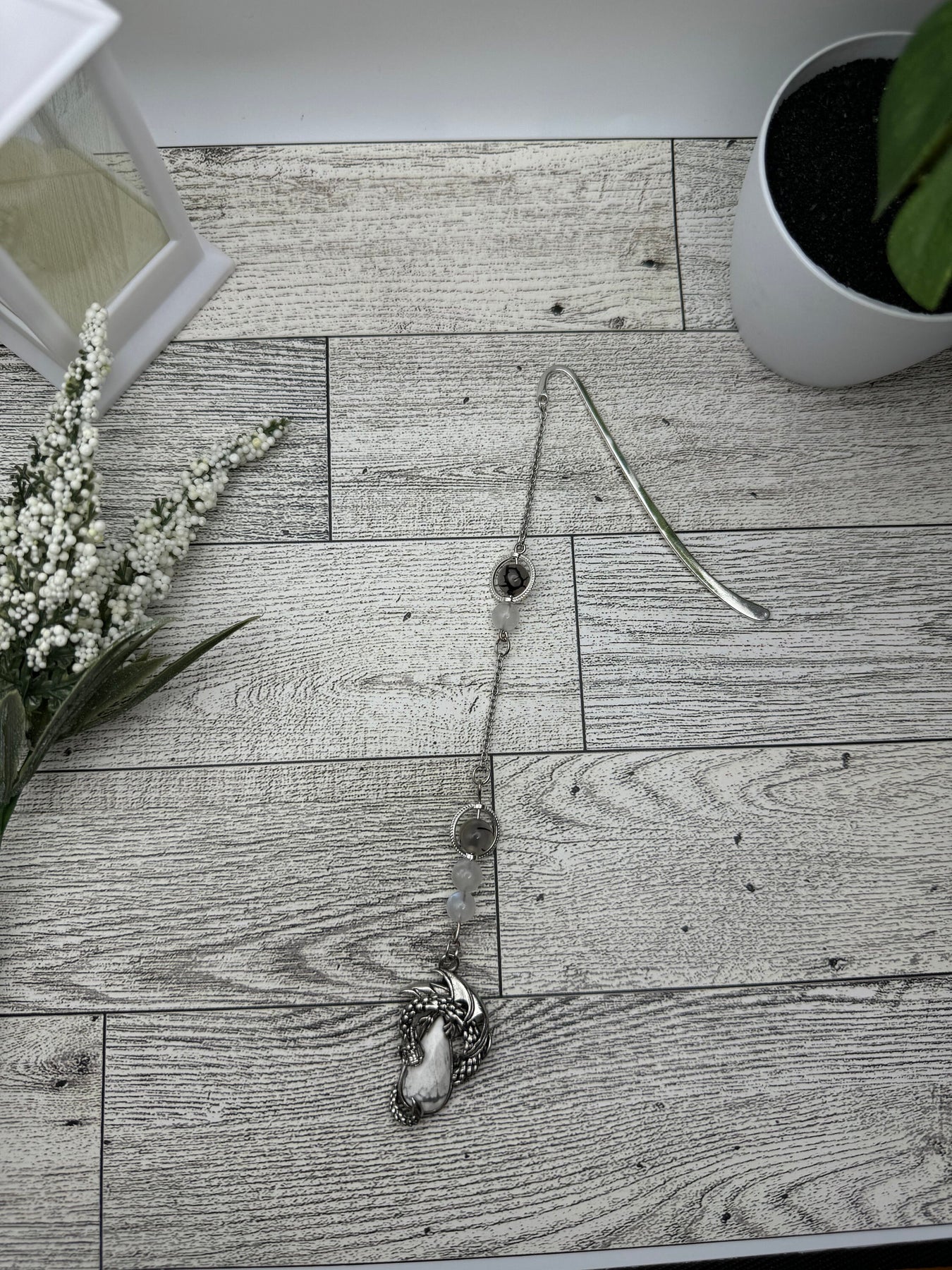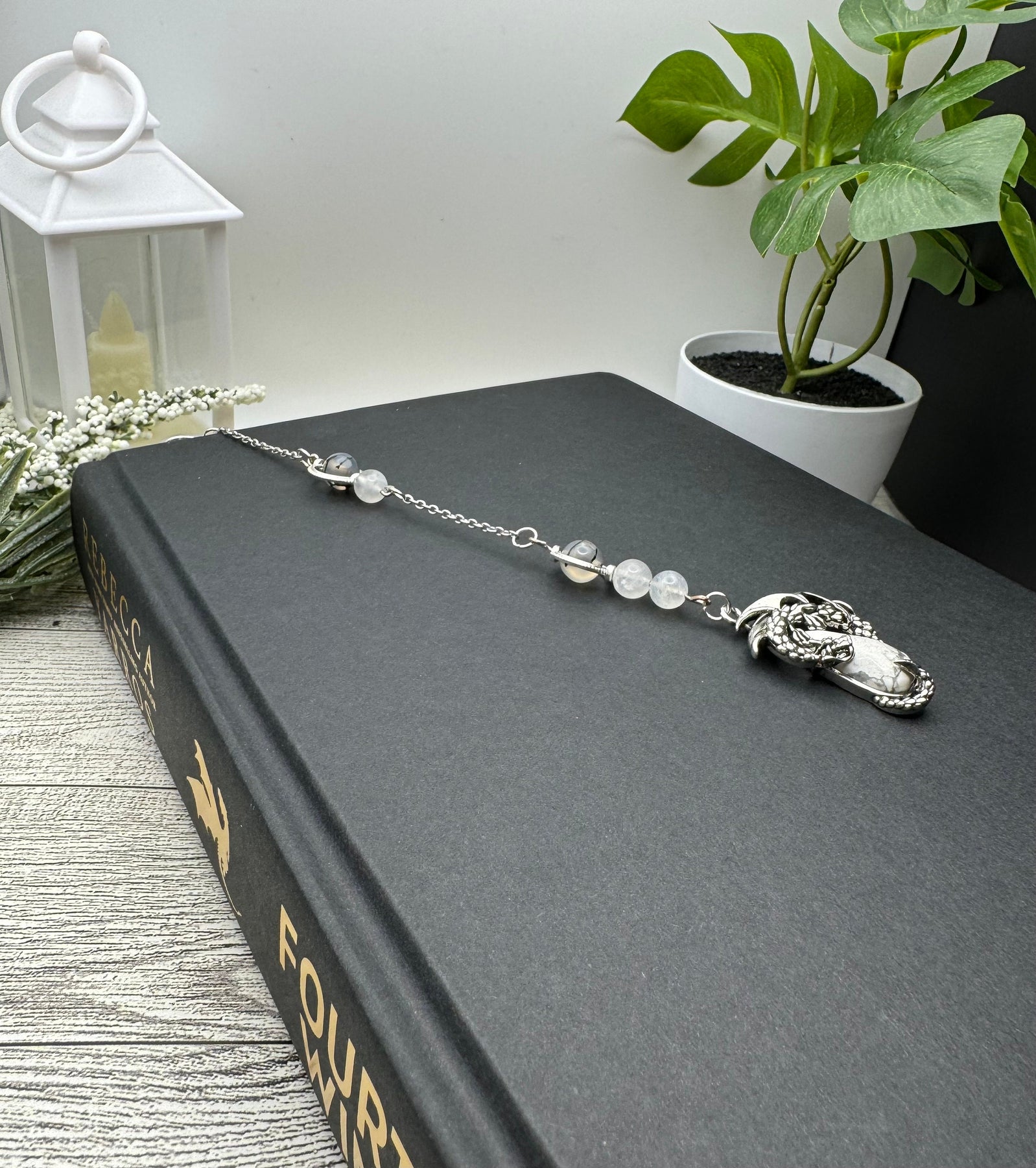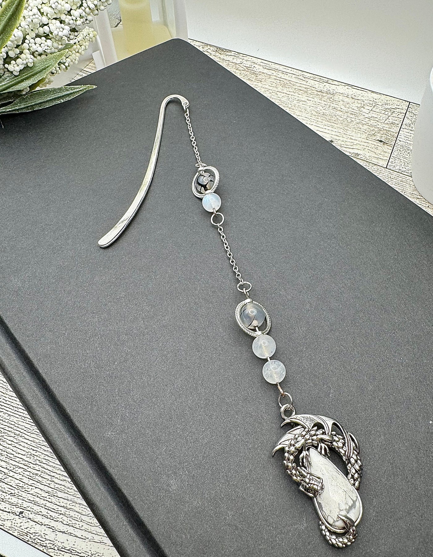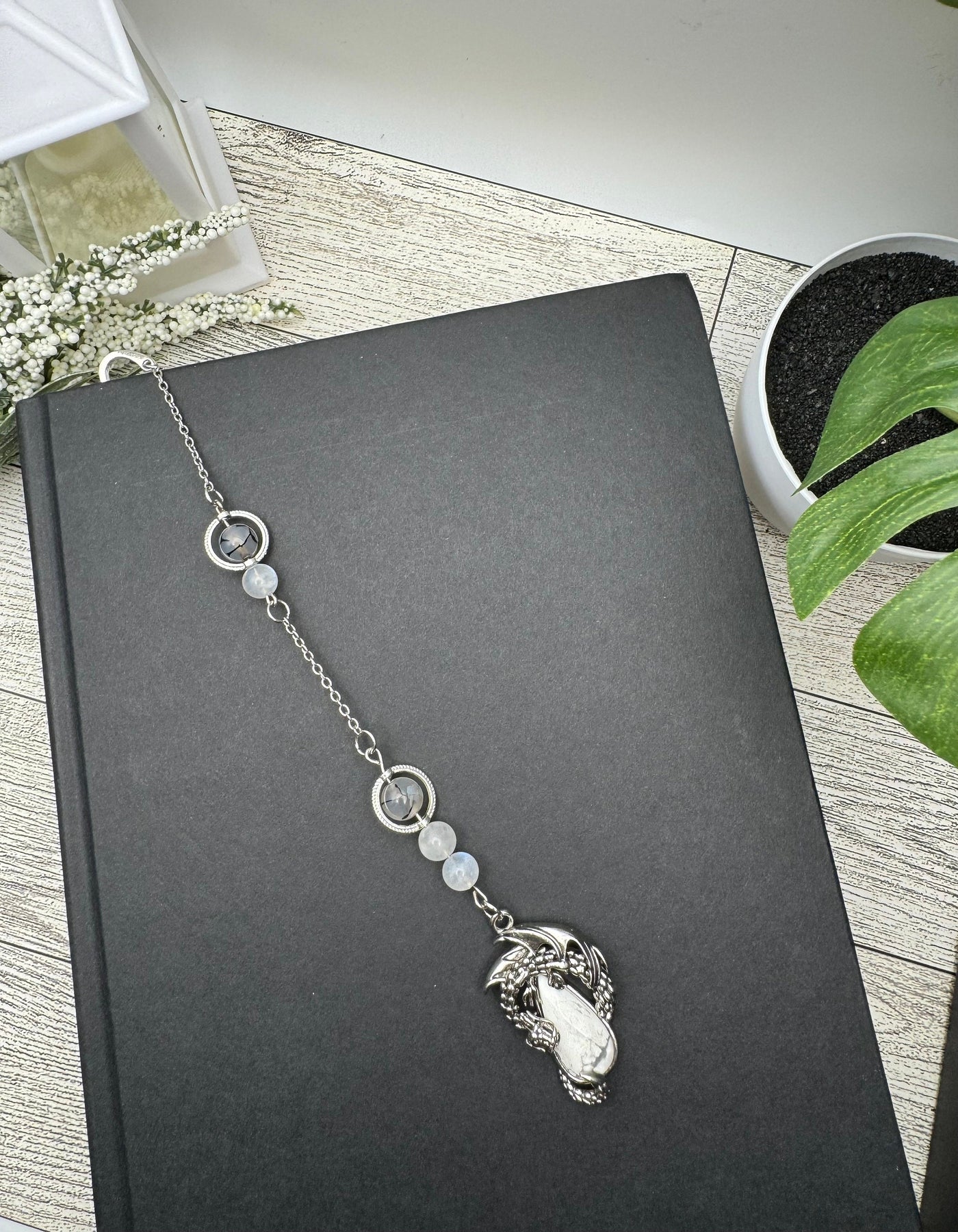 Add some style to your “in progress” books with this handmade dragon charm bookmark. It features a base metal dragon pendant with a natural howlite crystal, which is said to be the stone of patience, allowing you a chance to experience respite from the chaos of daily life. High quality dragons’ vein agate and moonstone beads with a subtle blue flash adorn the chain. Moonstone is said to deflect negativity and dragons’ vein agate is said to help with stability and calmness. 10/10 would be a nice addition to your reading and relaxation, if you ask me.