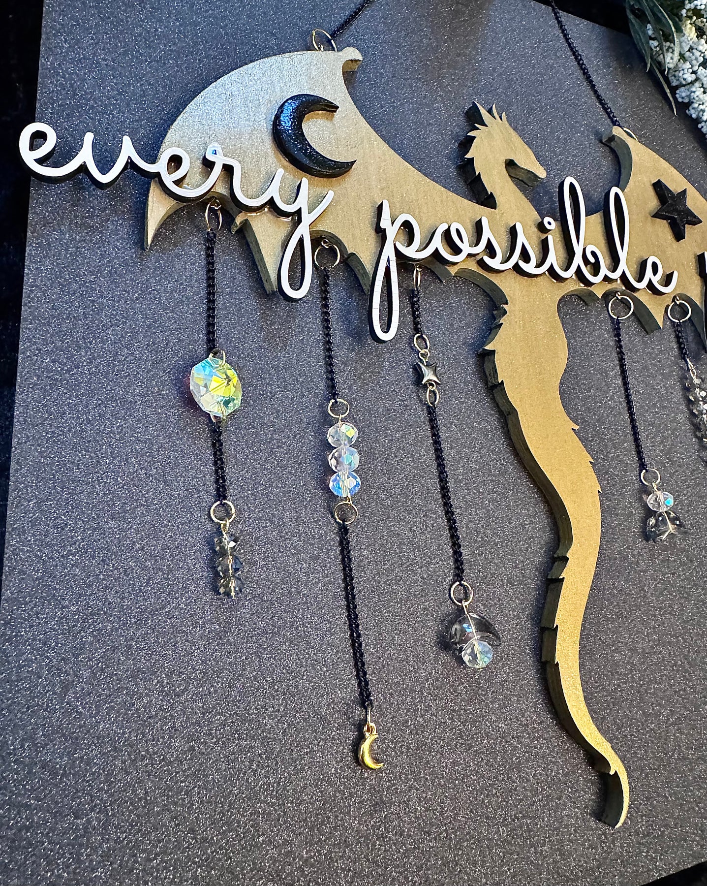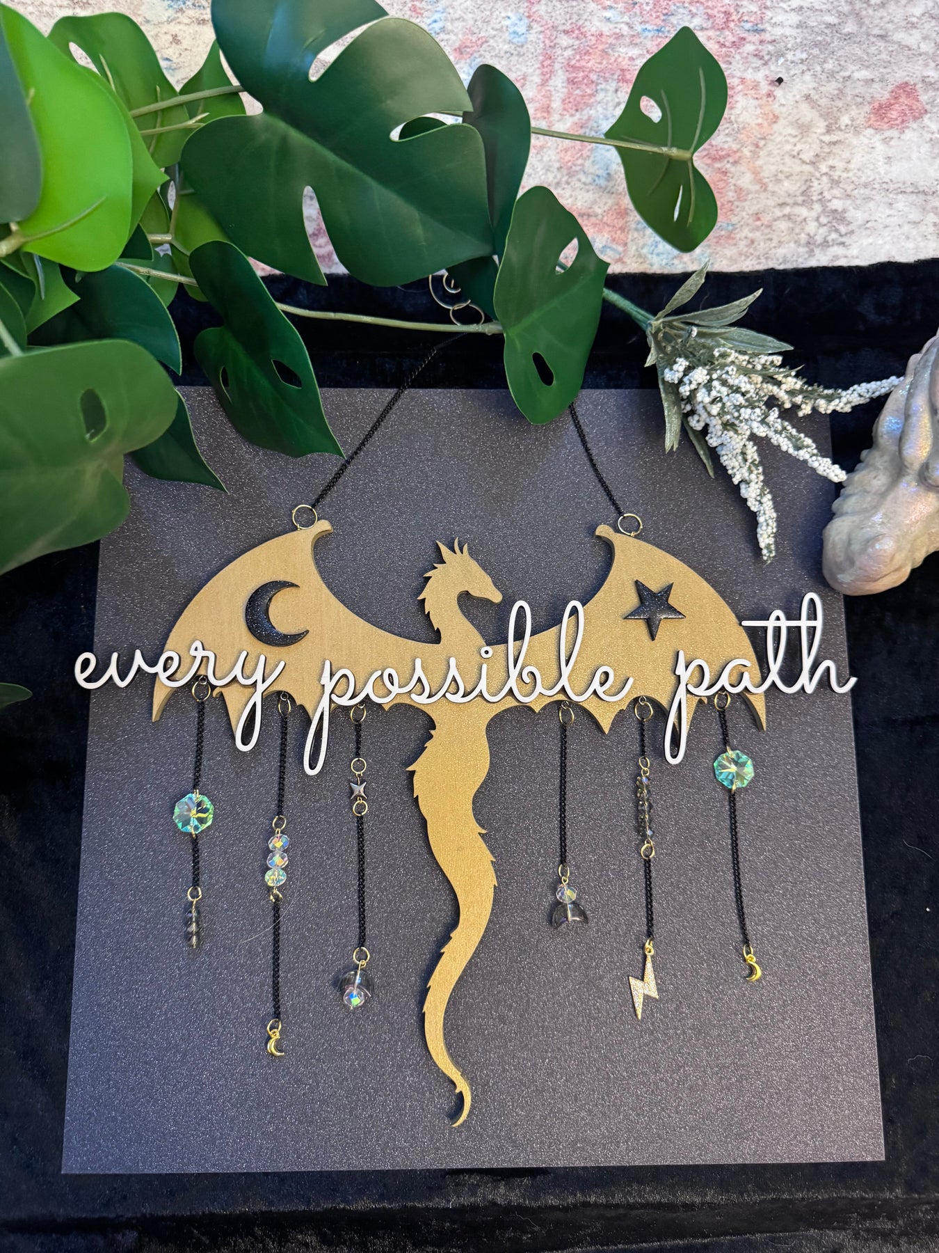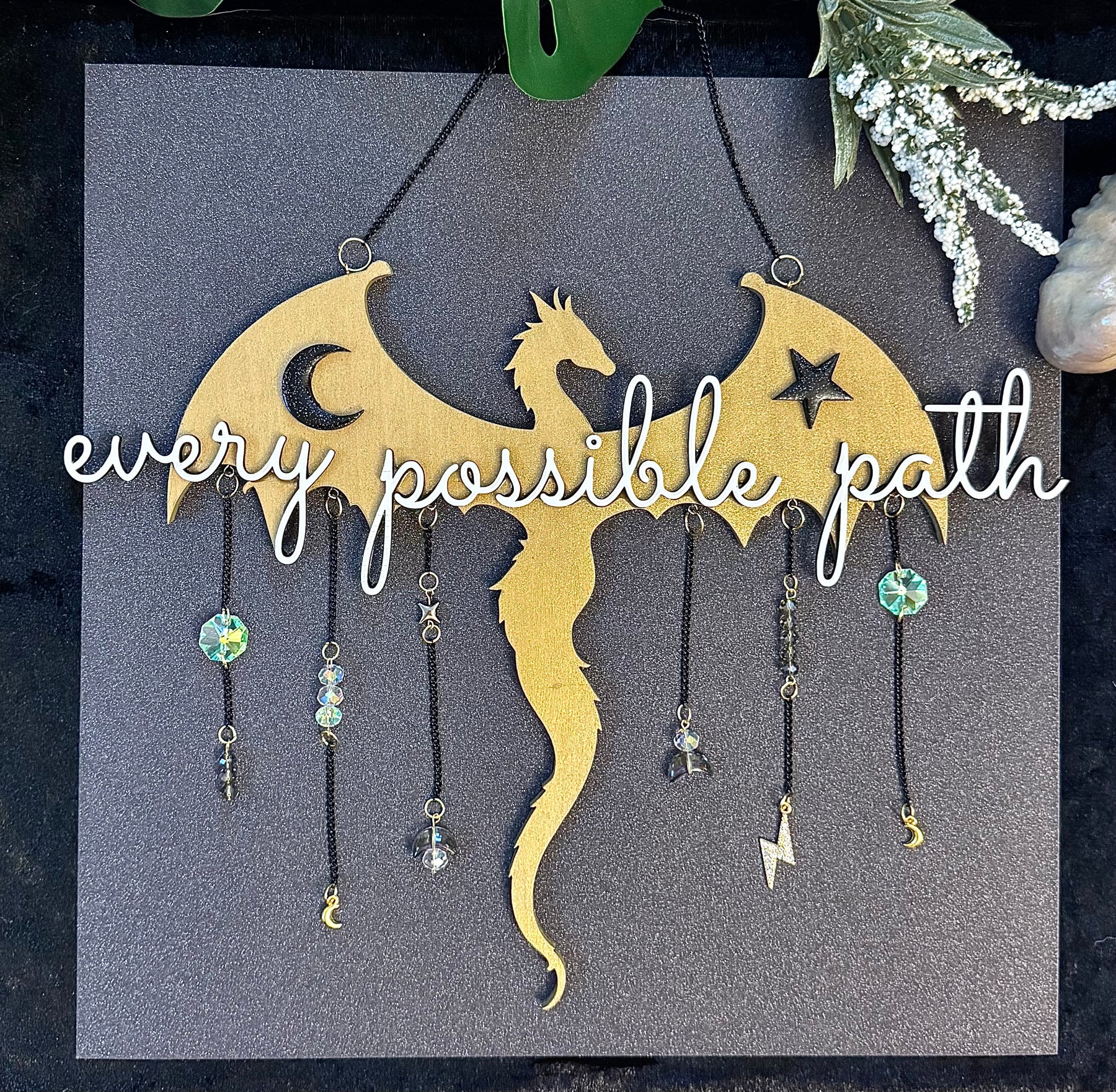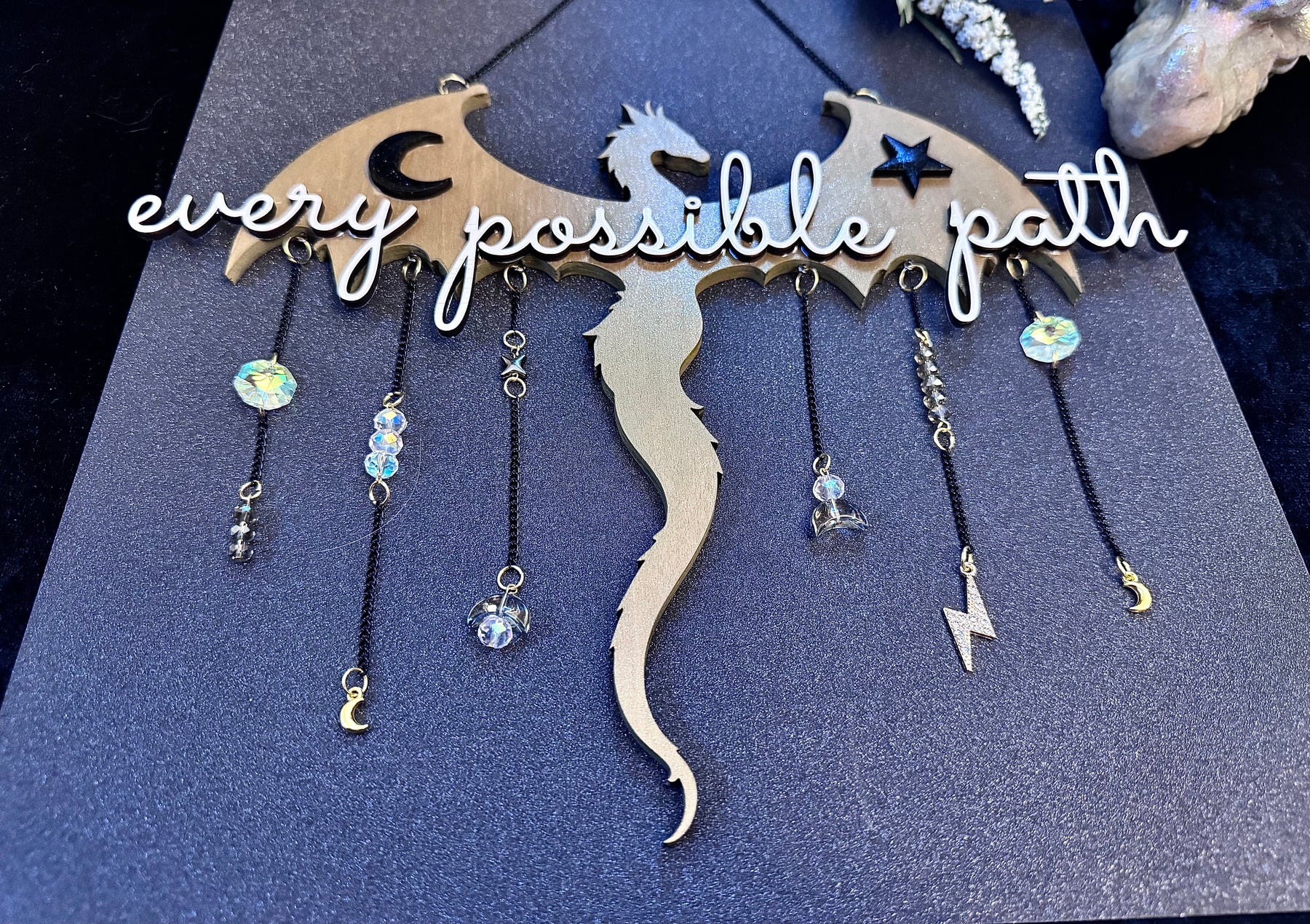 This handcrafted,Onyx Storm inspired dragon wall hanging is a quiet reminder that your story is still unfolding. Featuring a laser-cut dragon silhouette with celestial accents and dangling crystal elements, Every Possible Path catches the light gently and moves with the air, creating subtle sparkle without overwhelming a space.