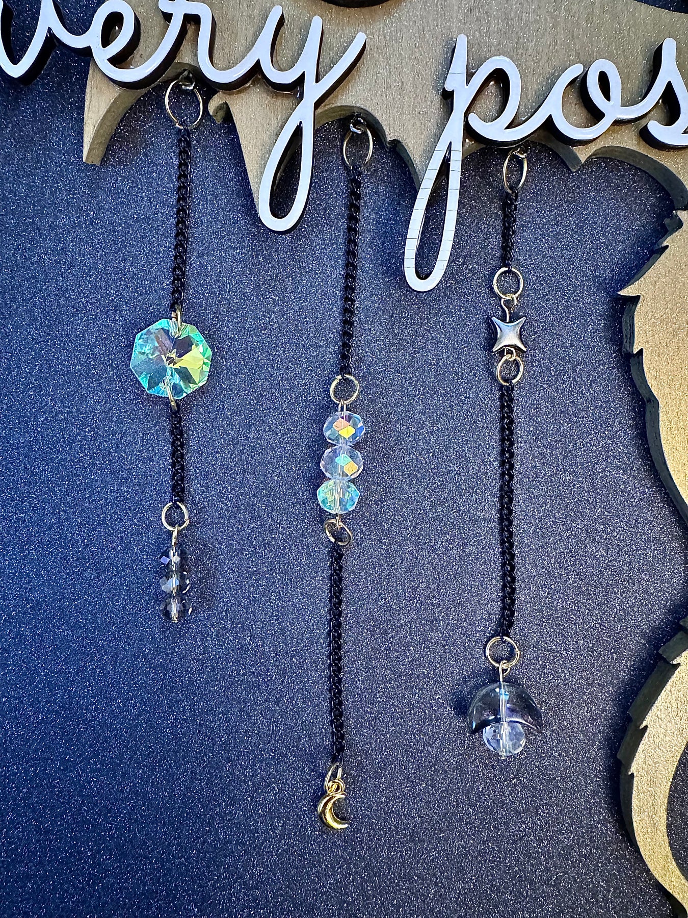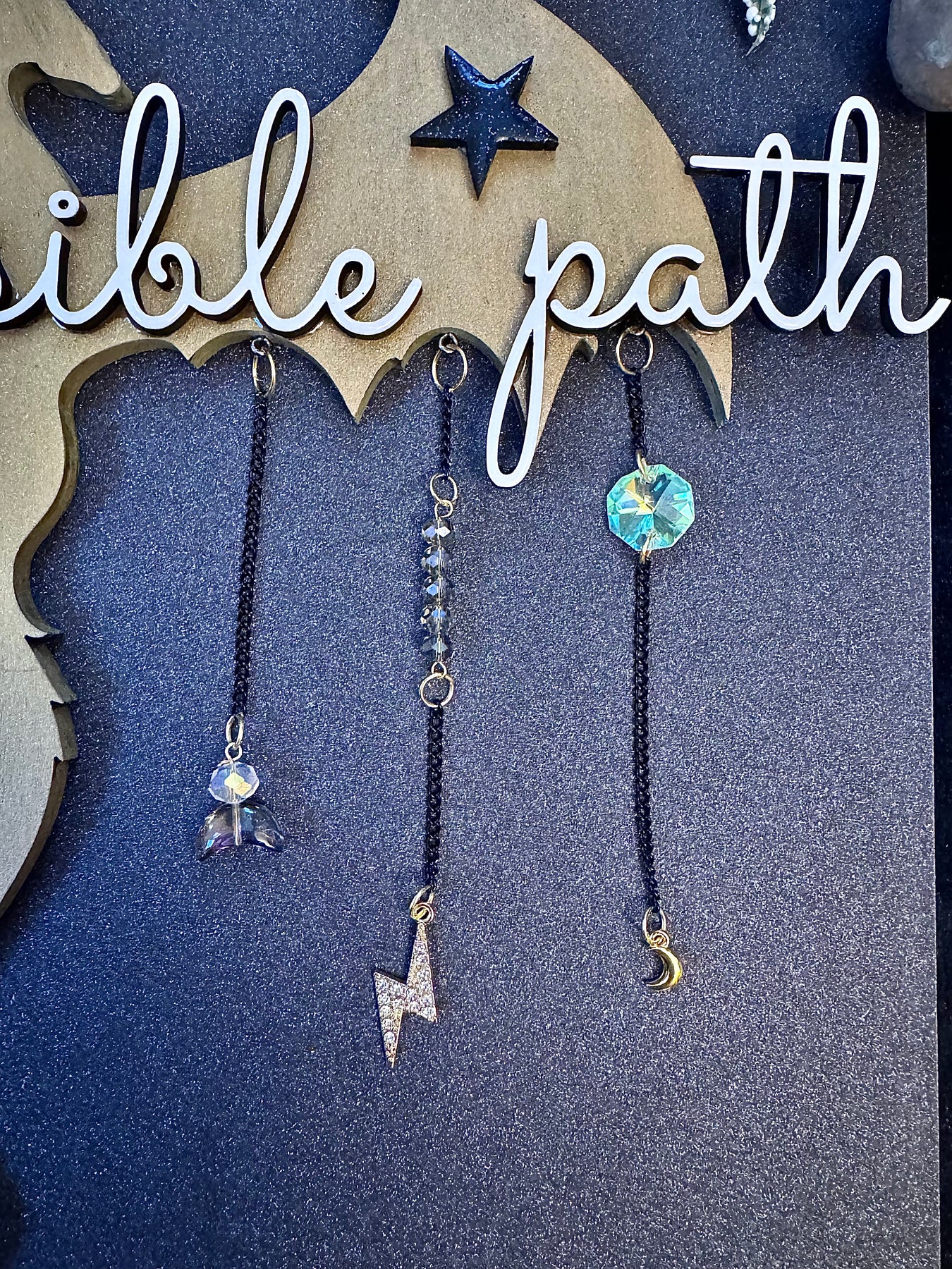 • Hand-assembled dangling crystal and charm strands