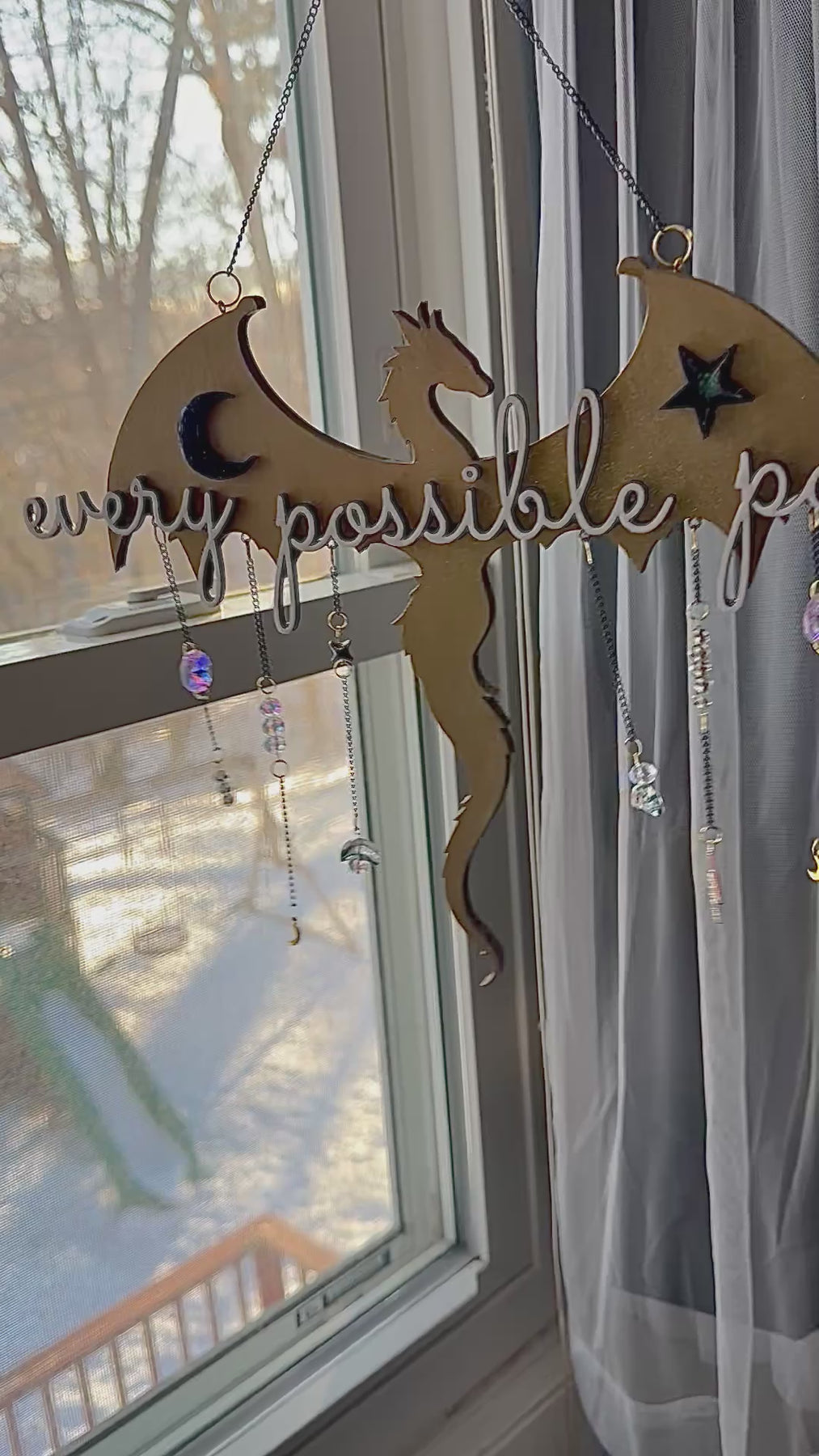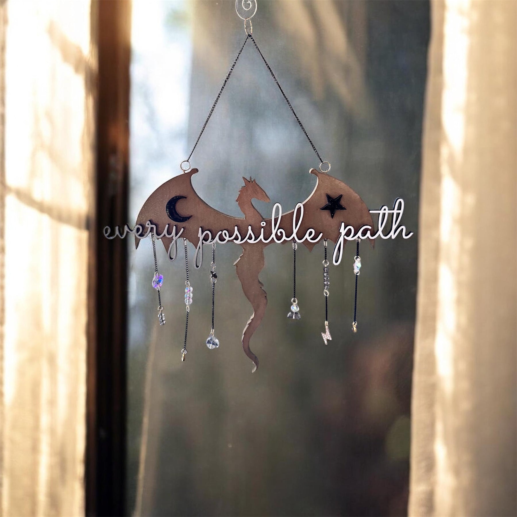 Designed to hang in a window, reading nook, or creative corner, this piece blends fantasy symbolism with modern, minimalist styling.