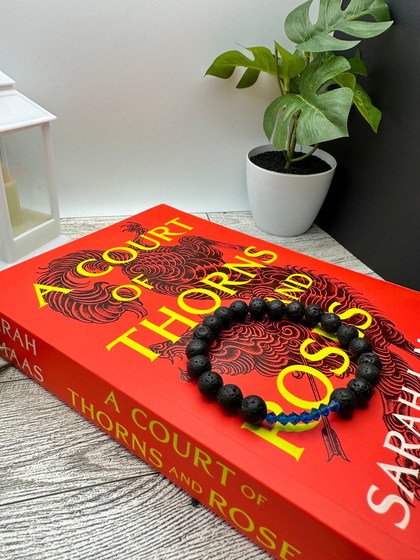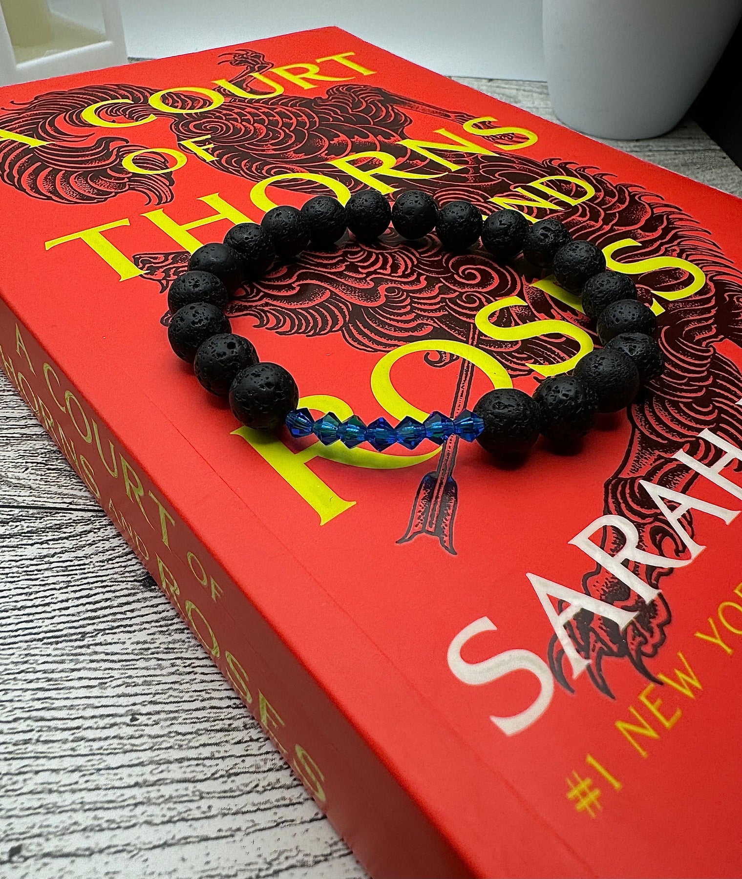 Are you jealous that the Shadowsinger has seven blue, shiny siphons? Well, now you, too, can have seven shiny blue things! This bracelet is a nod to Azriel from the ACOTAR world. It’s made with natural, high quality lava stone and seven blue Czechoslovakian crystals. Lava stone is said to be a grounding stone, and aids in calming one’s emotions, and dissipating anger and jealousy. But, those could never be traits of our Illyrian baby! Right?! … Cool thing about lava stone is it’s very absorbent. So, add some essential oils and conquer your day.
