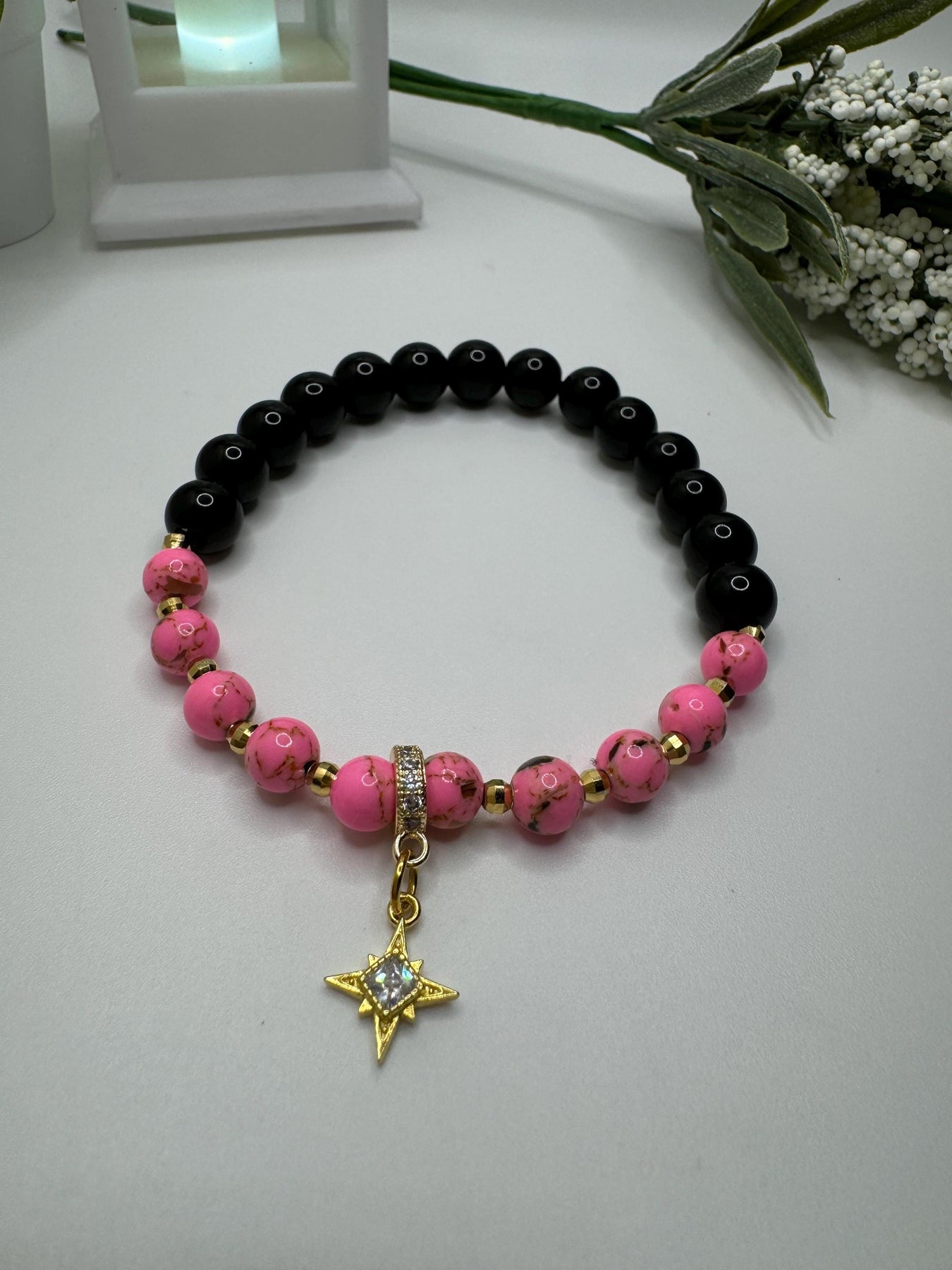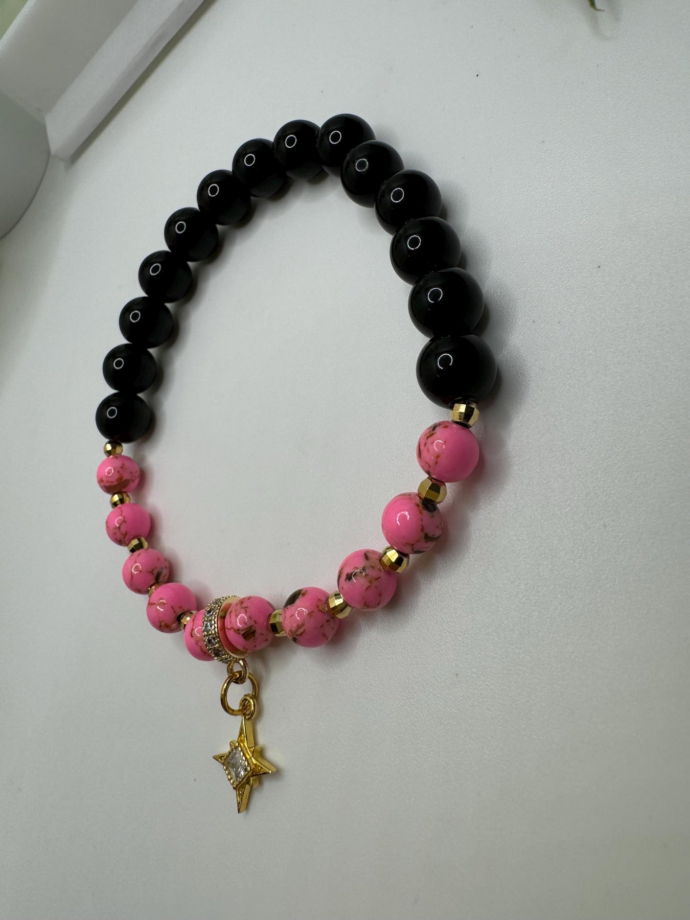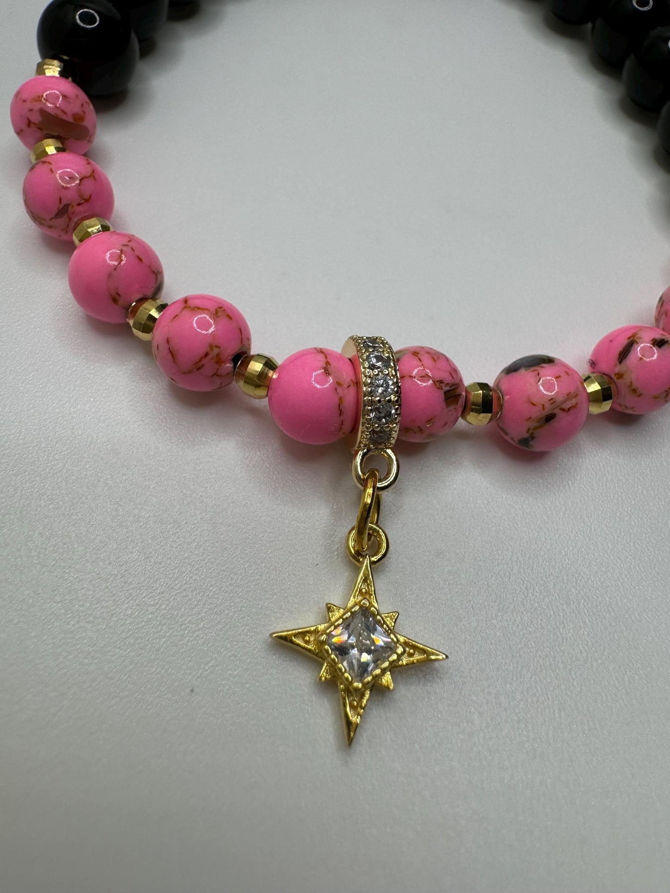 💥 Loud, lethal, and dipped in pink, just like our favorite half-fae chaos queen. This bracelet channels Bryce Quinlan energy with dyed howlite, black obsidian, and a gold star charm that screams “starborn.” And don’t worry, dying a crystal doesnt change its properties.