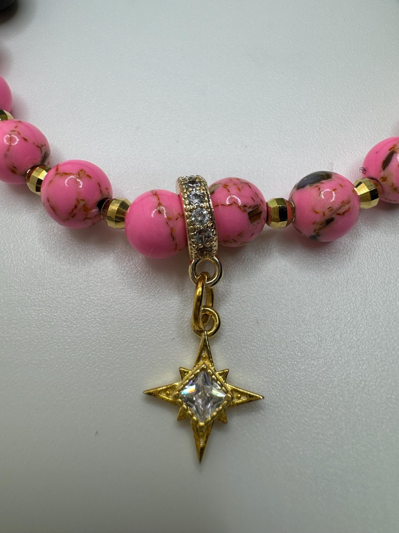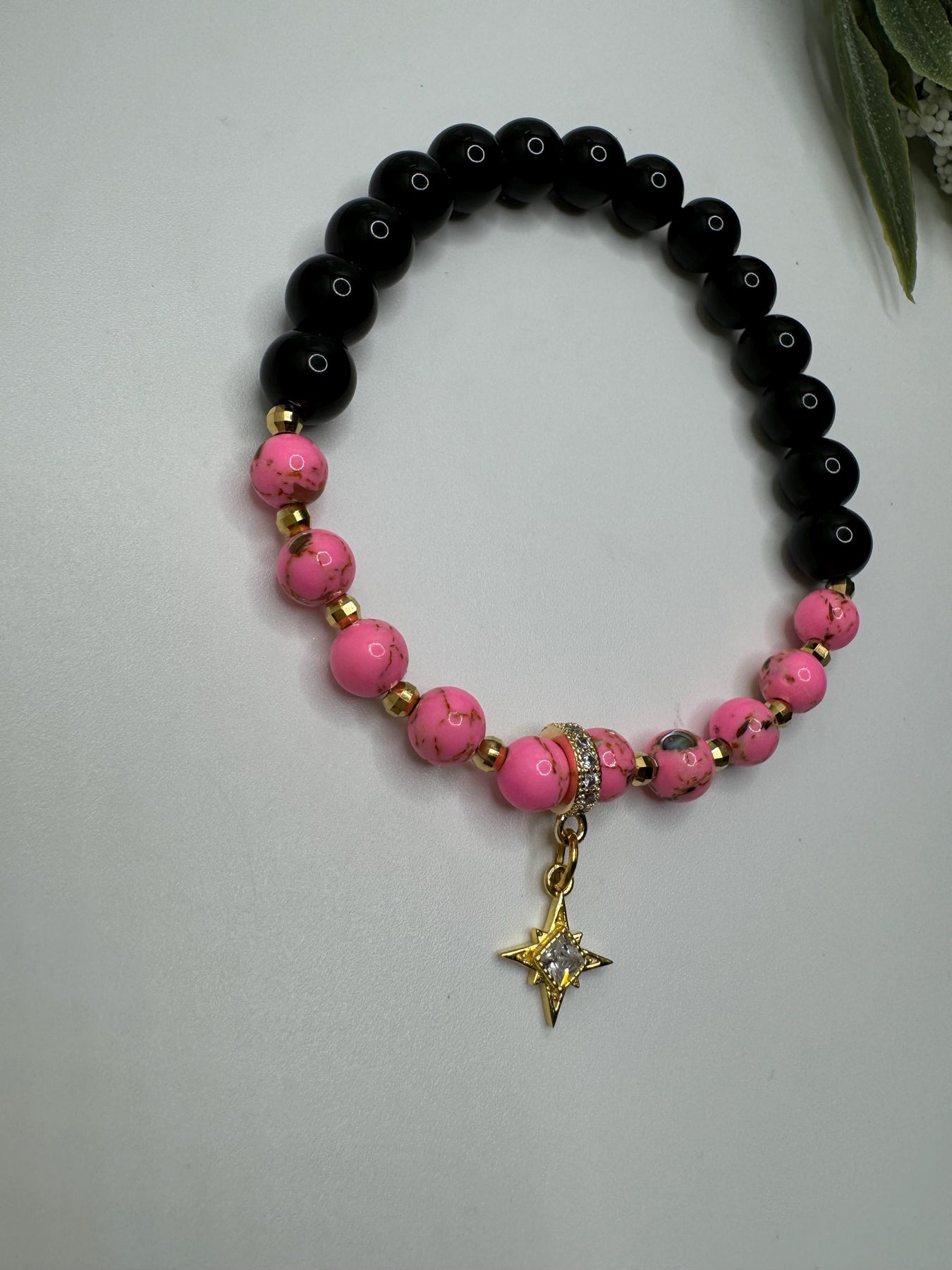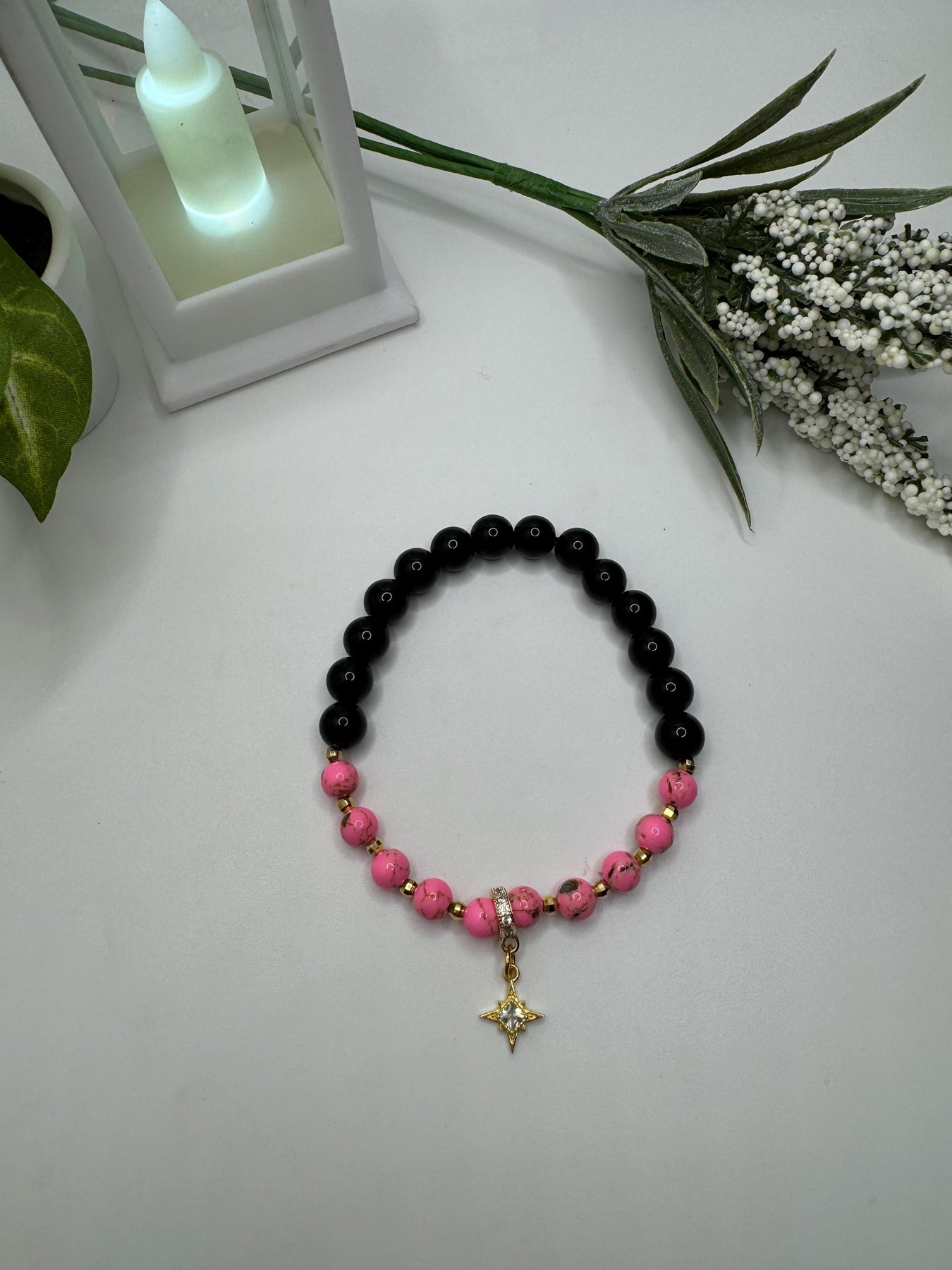 💥 Loud, lethal, and dipped in pink, just like our favorite half-fae chaos queen. This bracelet channels Bryce Quinlan energy with dyed howlite, black obsidian, and a gold star charm that screams “starborn.” And don’t worry, dying a crystal doesnt change its properties.
