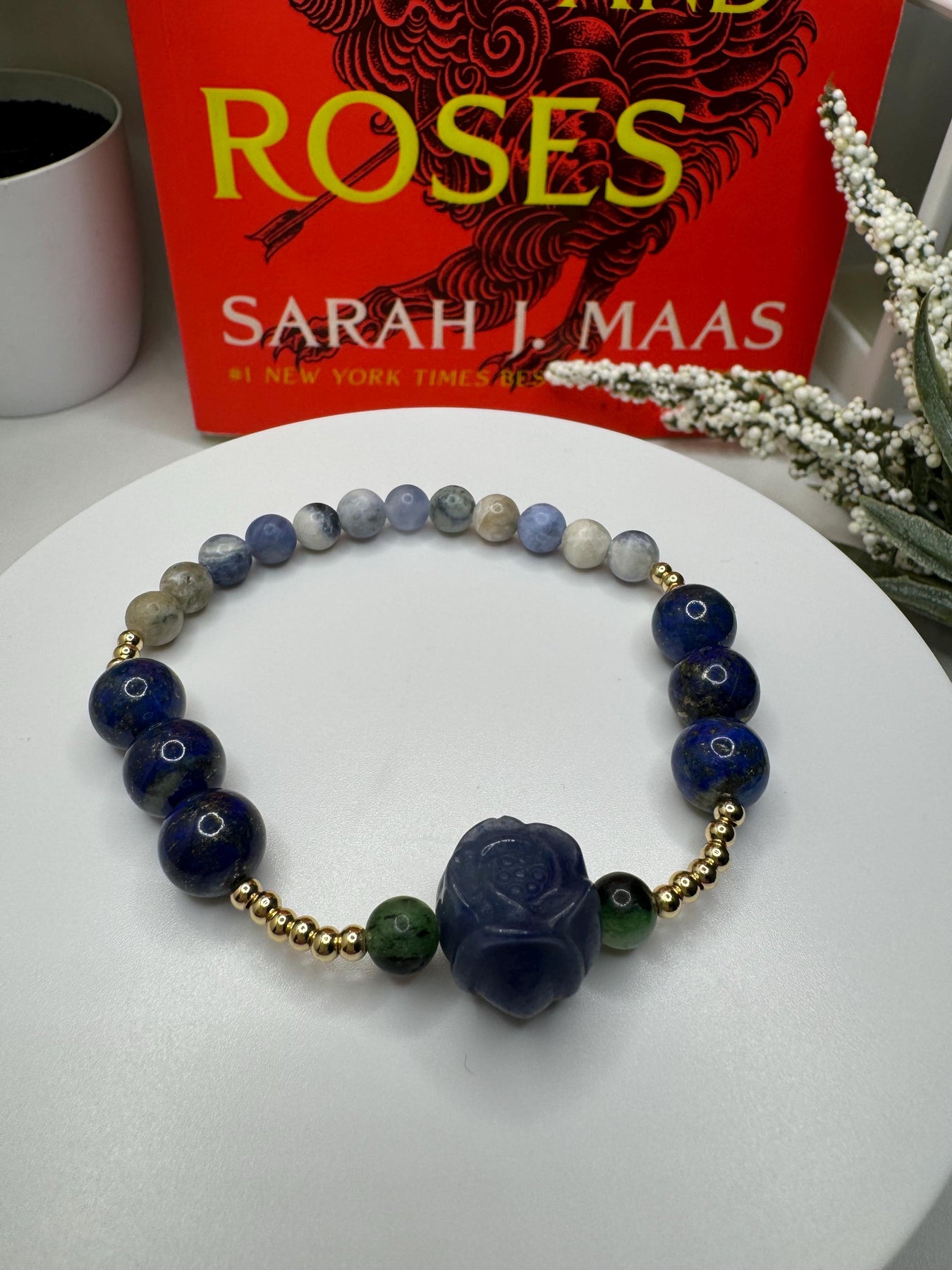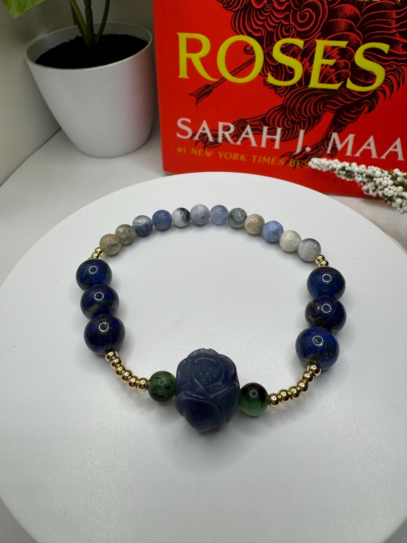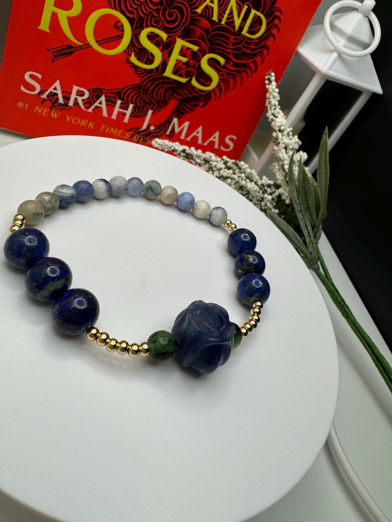 This bracelet is inspired by Feyre Archeron before her glow-up in ACOMAF. It's made with an alashan agate blue rose between ruby in zoisite beads, 10mm lapis lazuli accent beads, and finished up with some sodalite. It's also adorned with 18k gold filled spacer beads, adding the perfect touch of elegance to all those deep shades of blue. Lest we forget...lapis lazuli has quite the symbolism in book one when it comes to our favorite Archeron sister...*wink*