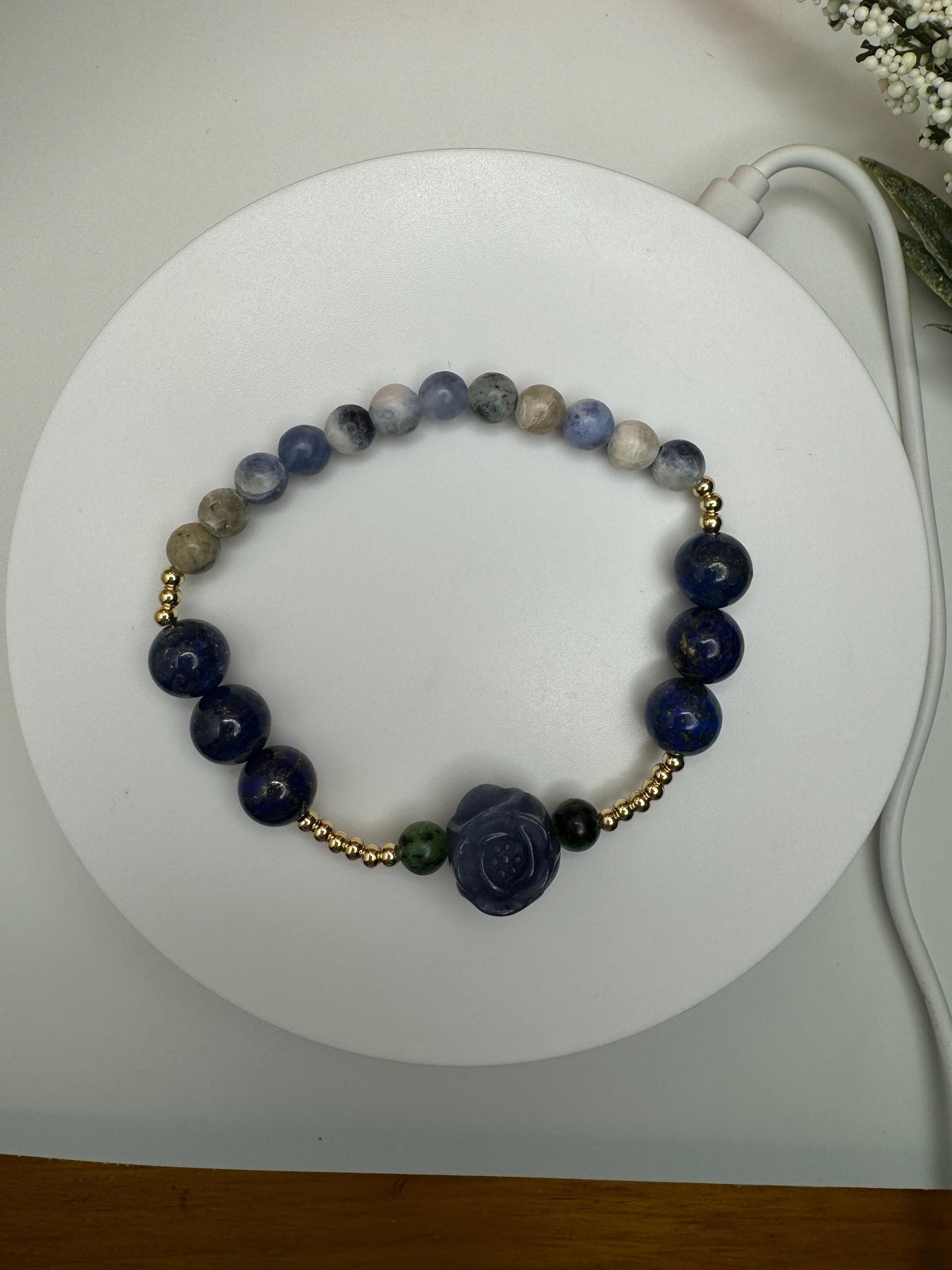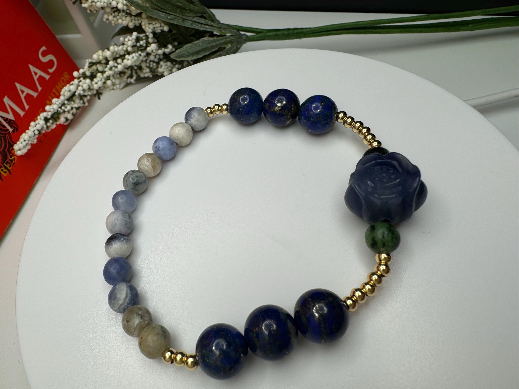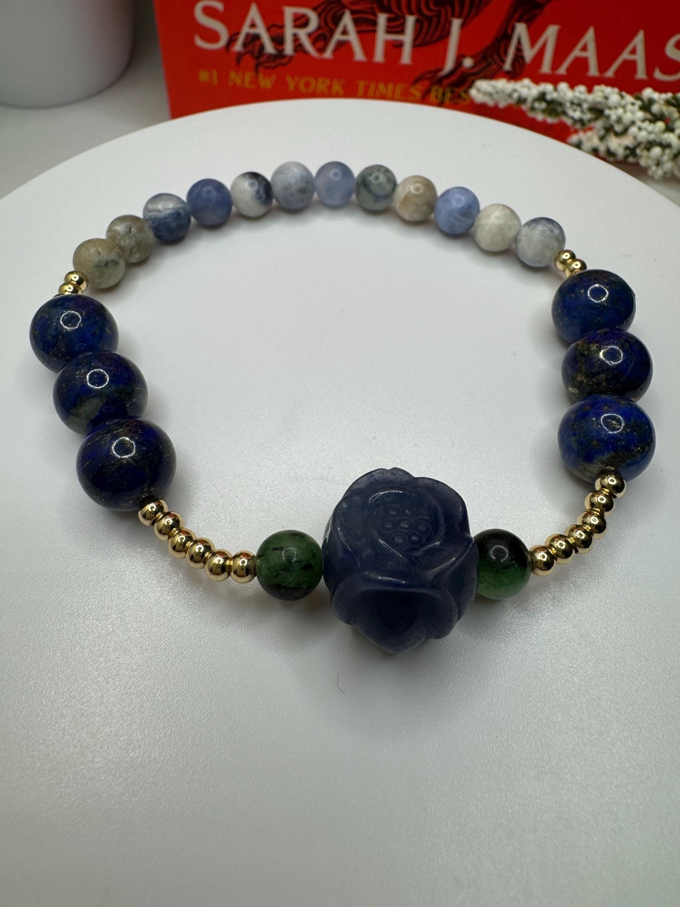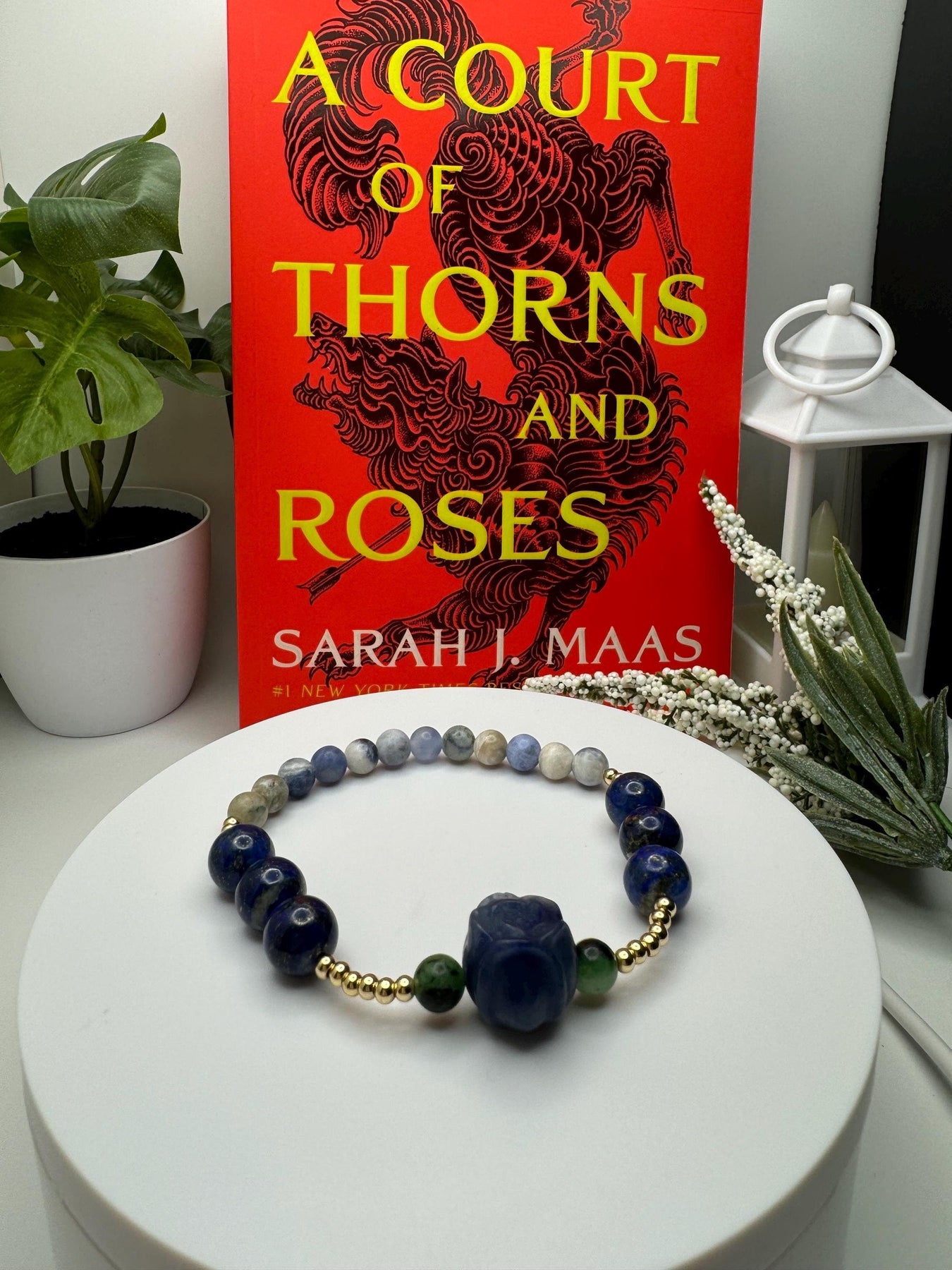 This bracelet is inspired by Feyre Archeron before her glow-up in ACOMAF. It's made with an alashan agate blue rose between ruby in zoisite beads, 10mm lapis lazuli accent beads, and finished up with some sodalite. It's also adorned with 18k gold filled spacer beads, adding the perfect touch of elegance to all those deep shades of blue. Lest we forget...lapis lazuli has quite the symbolism in book one when it comes to our favorite Archeron sister...*wink*